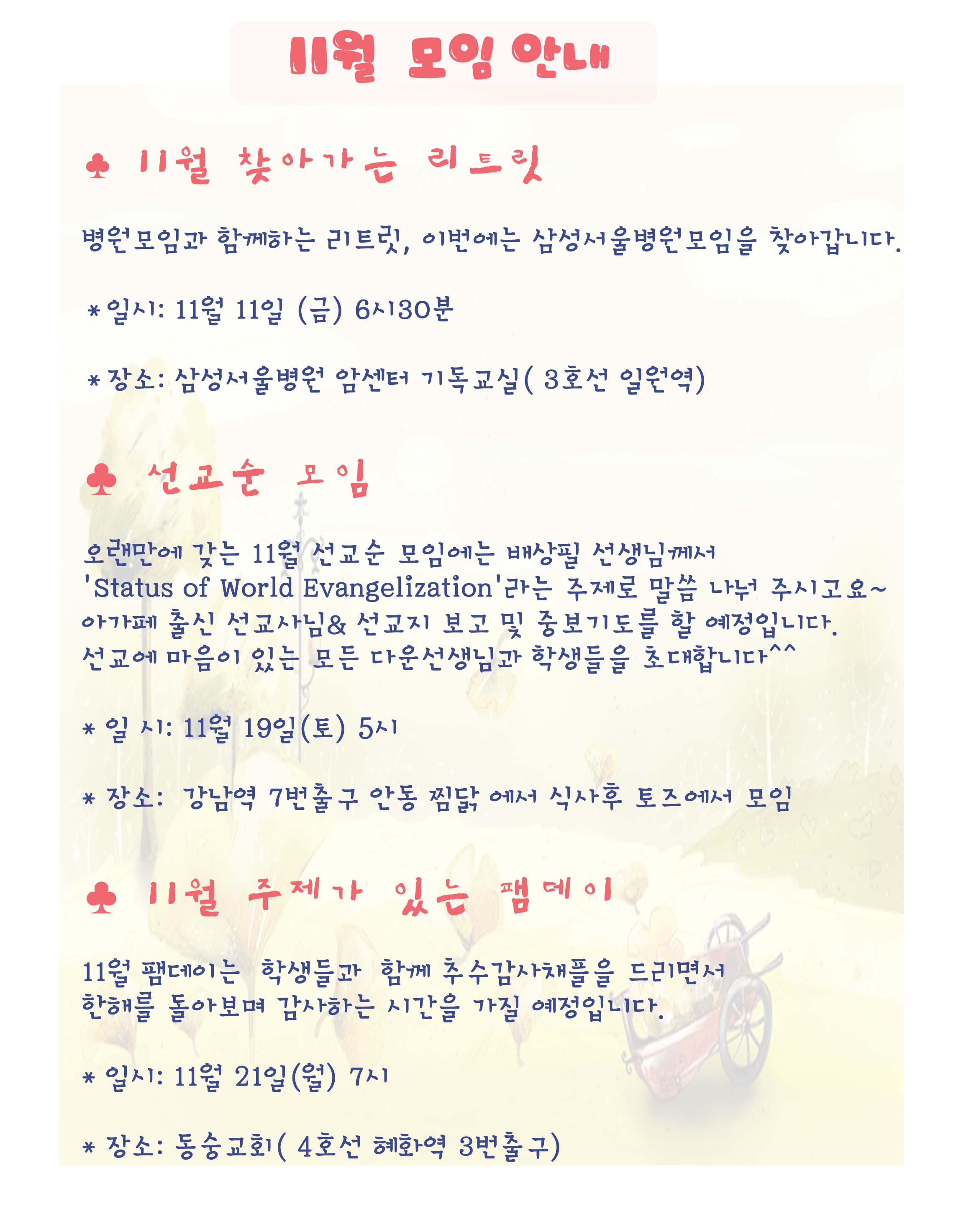 11월 모임 안내(찾아가는 리트릿, 선교순 모임, 팸데이)