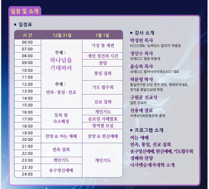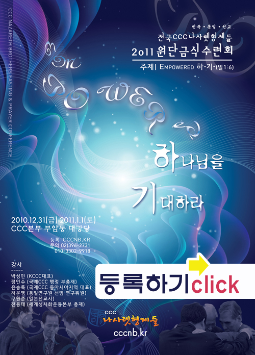나사렛 금식 수련회^^![]() ![]() <2011년 원단금식수련회 등록안내> 나사렛 원단 금식 수련회가 2010년 12월 31일(금) 부터 2011년 1월 1일까지(토) 1박2일 할예정입니다.^^ 등록은 3만원 인터넷등록이 없는 현장등록은 3만5천원입니다. 12월30일 수련회 전날까지입니다. http://cccnb.kr/regi_event/2011wondan/regi_main.php 위에 홈페이지 들어가셔서 등록 하시면 됩니다^^ 그리고 나사렛 금식 수련회 참여하시는 분들은 연락 주세요~ 아가페 : 02-913-7041~2(김은선, 박순이간사) |