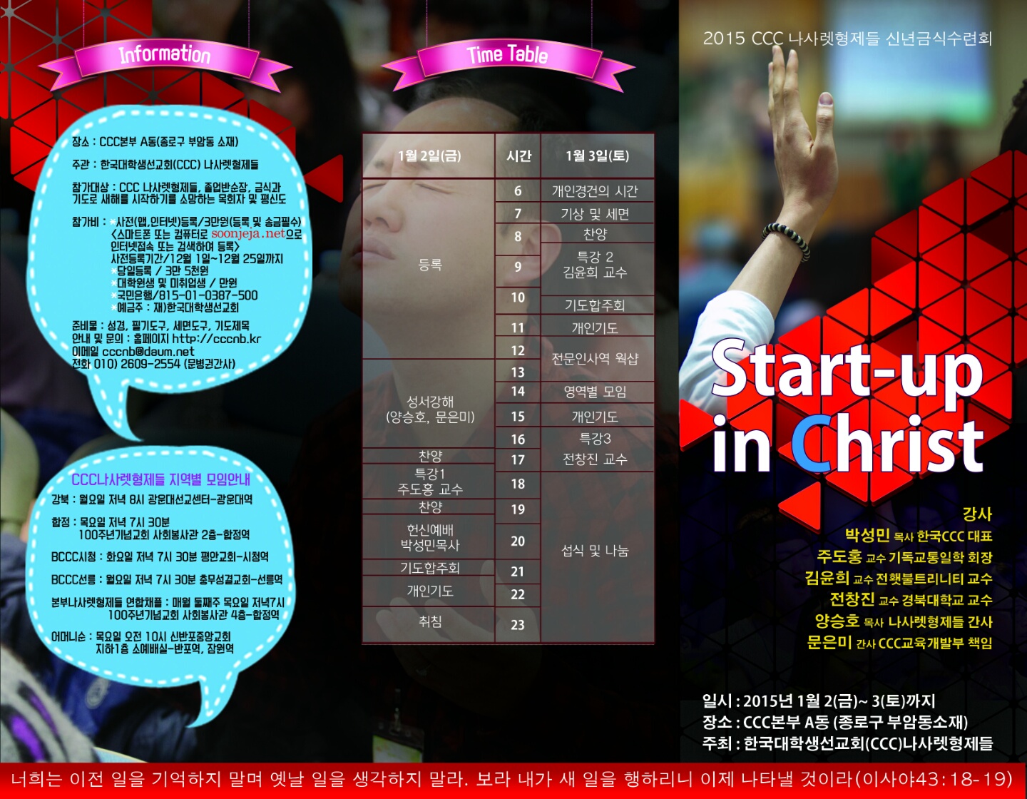 2015 CCC 나사렛형제들 신년금식수련회![]() "Start-Up in Christ" 2015년 1월2일(금) -3일(토) CCC본부 A동 강사: 박성민목사 주도홍교수(기독교통일학 회장) / 김윤희교수(전 횃불트리니티 교수) /전창진교수(경북대학교 교수) / 양승호목사(나사렛형제들간사) / 문은미간사(CCC교육개발부 책임) 참가대상 : CCC나사렛형제들, 졸업반순장 금식과 기도로 새해를 시작하기를 소망하는 목회자 및 평신도 참가비 : 사전등록(앱, 인터넷) = 3만원 (등록 및 송금은 필수) 스마트폰 또는 컴퓨너로 soonjeja.net 으로 인터넷접속 또는 검색하여 등록 * 사전등록기간 : 12월 1일 -12월 25일 까지 * 당일등록 = 35000원// * 대학원생 및 미취업생 = 10,000원 * 국민은행 815-01-0387-500 재)한국대학생선교회 준비물 : 성경, 필기도구, 세면도구, 기도제목 안내및문의 : 홈페이지 http://cccnb,kr // 이메일 " rel="nofollow"> 전화 : 010-2609-2554 (문병권간사) |