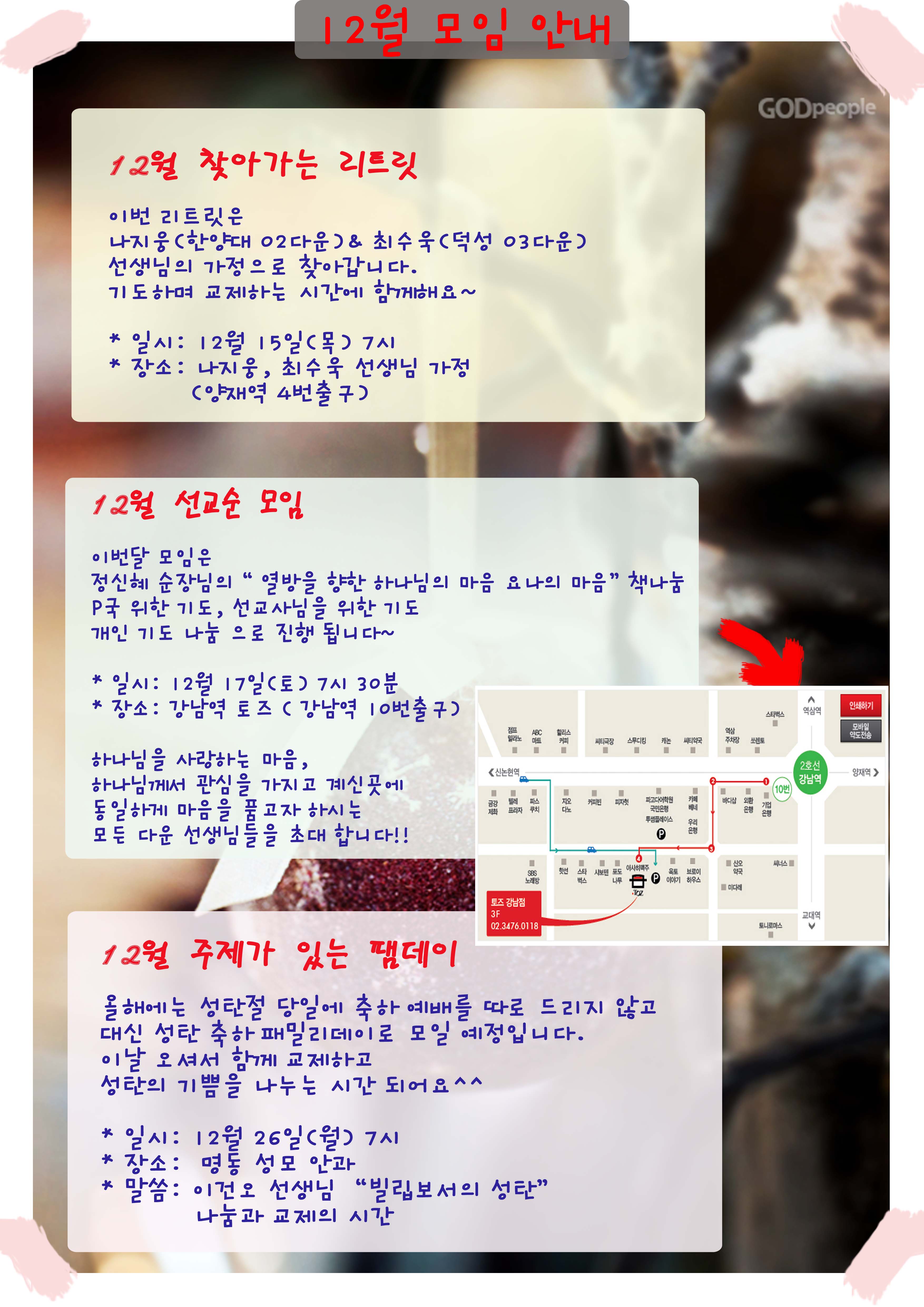 12월 모임안내(리트릿, 선교순모임, 팸데이)