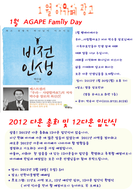 1월 팸데이 & 2012년 다운 총회 및 입단식 안내 > 아가페 뉴스