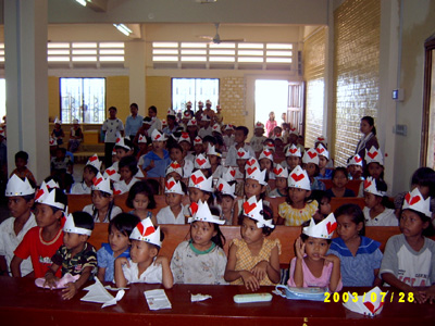 종이를 나눠주고 접기에 들어갔습니다. 처음 쉬운 부분은 많은 아이들이 따라 할 수 있었지만 조금 어려워지면서 조금은 어수선하여지고 돕는 손길이 많지 않는 저희로서는 난감 할 수 밖에 없었습니다. 가장 손이 필요한 시기였는데 미리 신학생들과 이야기 하지 못했던 부분이 선생님껜 참으로 미안했습니다. 여기 저기서 서로 해 달라며 "teacher" 를 부르는 아이들....