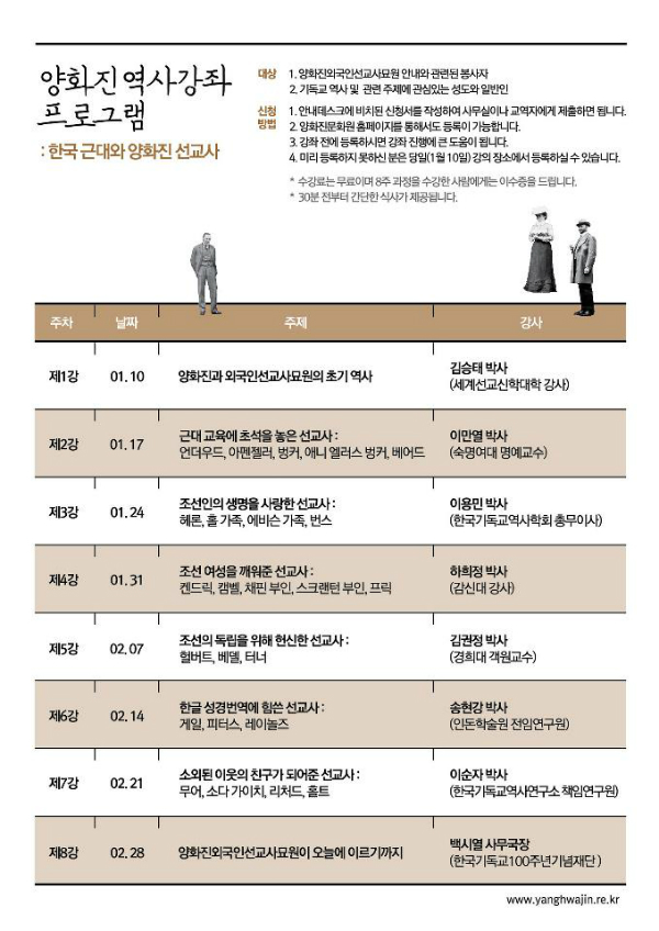 양화진 역사강좌![]() 한국 근대 역사와 외국인 선교사의 사역들을 동시에 공부할 수 있는 강좌가 열리고 있습니다. 양화진문화원(명예원장 이어령·원장 박흥식)은 한국기독교역사연구소(소장 이덕주)와 공동 주관으로 '양화진 안장 외국인 선교사 깊이 알기' 역사 강좌를 준비하였습니다. 이만열 전 국사편찬위원장과 김승태 박사 등의 최근 연구 성과들이 반영되어 마련된 이번 강좌는 1월 10일부터 2월 28일까지 매주 목요일 저녁 7시 마포구 합정동 양화진외국인선교사묘원 내 선교기념관에서 열립니다. 강의는 '근대 교육에 초석을 놓은 선교사', '조선인의 생명을 사랑한 선교사', '조선의 독립을 위해 헌신한 선교사', '조선 여성을 깨워 준 선교사', '한글 성경 번역에 힘쓴 선교사' 등의 주제로 진행되며 언더우드·홀 가족·채핀 부인·헐버트·게일·홀트 등 양화진에 안장된 선교사들을 다루는 시간입니다. 총 8회에 걸쳐 진행되는 이번 역사 강좌는 무료이며 양화진문화원 홈페이지(www.yanghwajin.re.kr)에서 사전 등록할 수 있다. 강의 시작 30분 전부터 간단한 식사가 제공되며 8주 강좌에 모두 출석한 참가자에게는 수료증도 발급된다고 합니다. 문의 : 02-332-9171(양화진문화원) |
