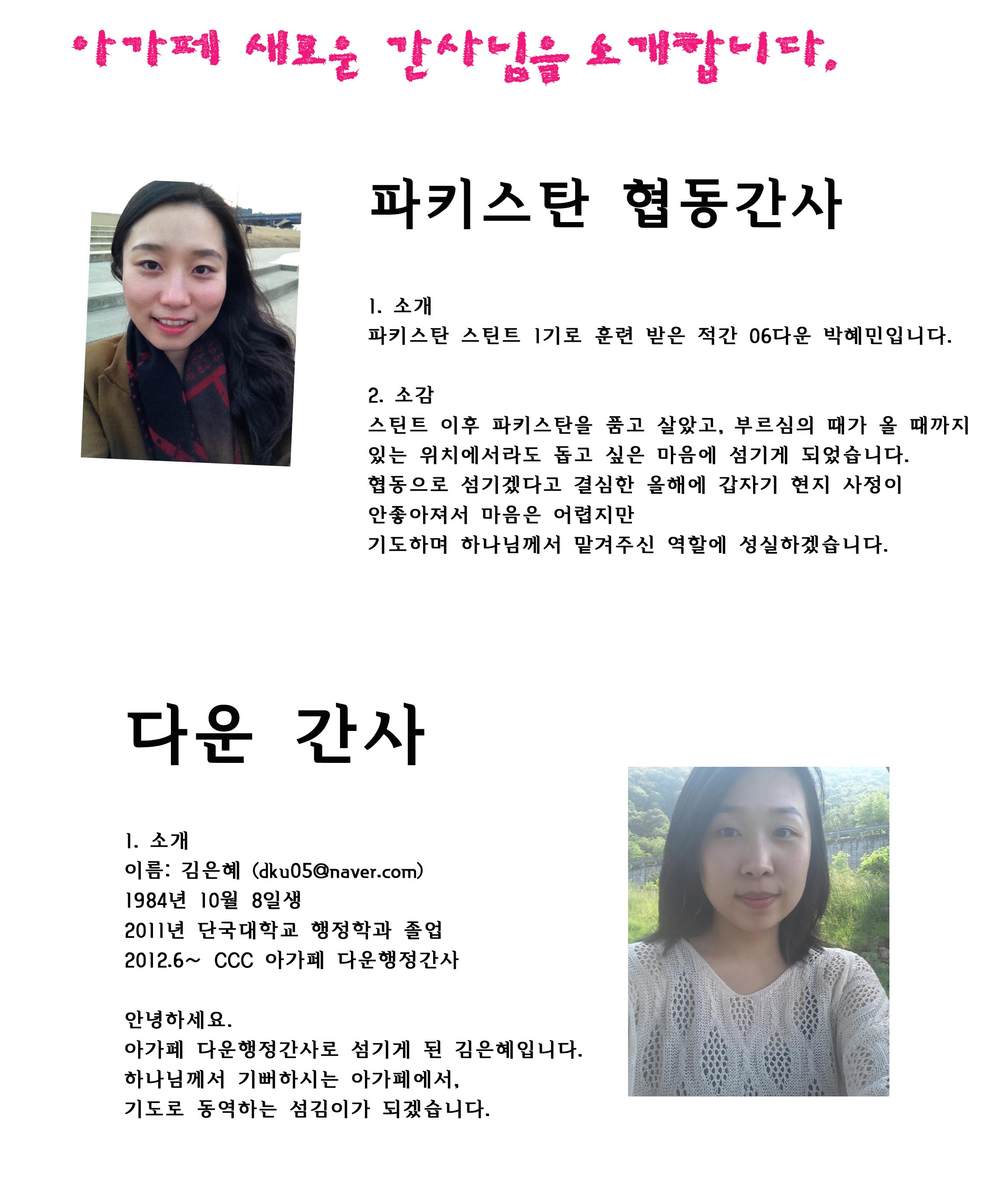 은혜 간사님은 전임으로 순이 간사님과 함께 사역을 할 것입니다. 두분 모두 환영하고, 많은 격려를 부탁드려요 !! ^^