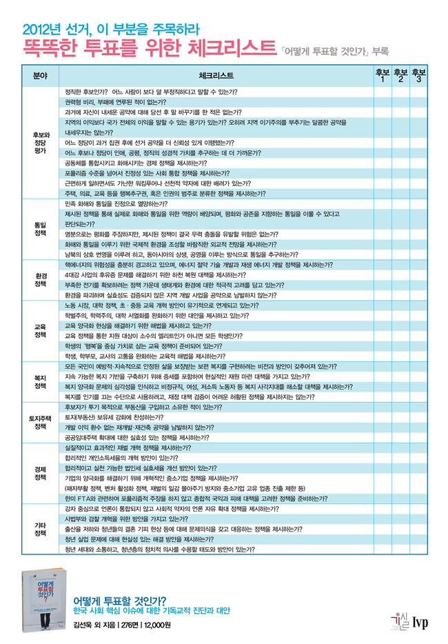 ※ 본 체크리스트는 「어떻게 투표할 것인가?」(IVP)의 부록입니다. 원하시는 만큼 복사해서 사용하세요~