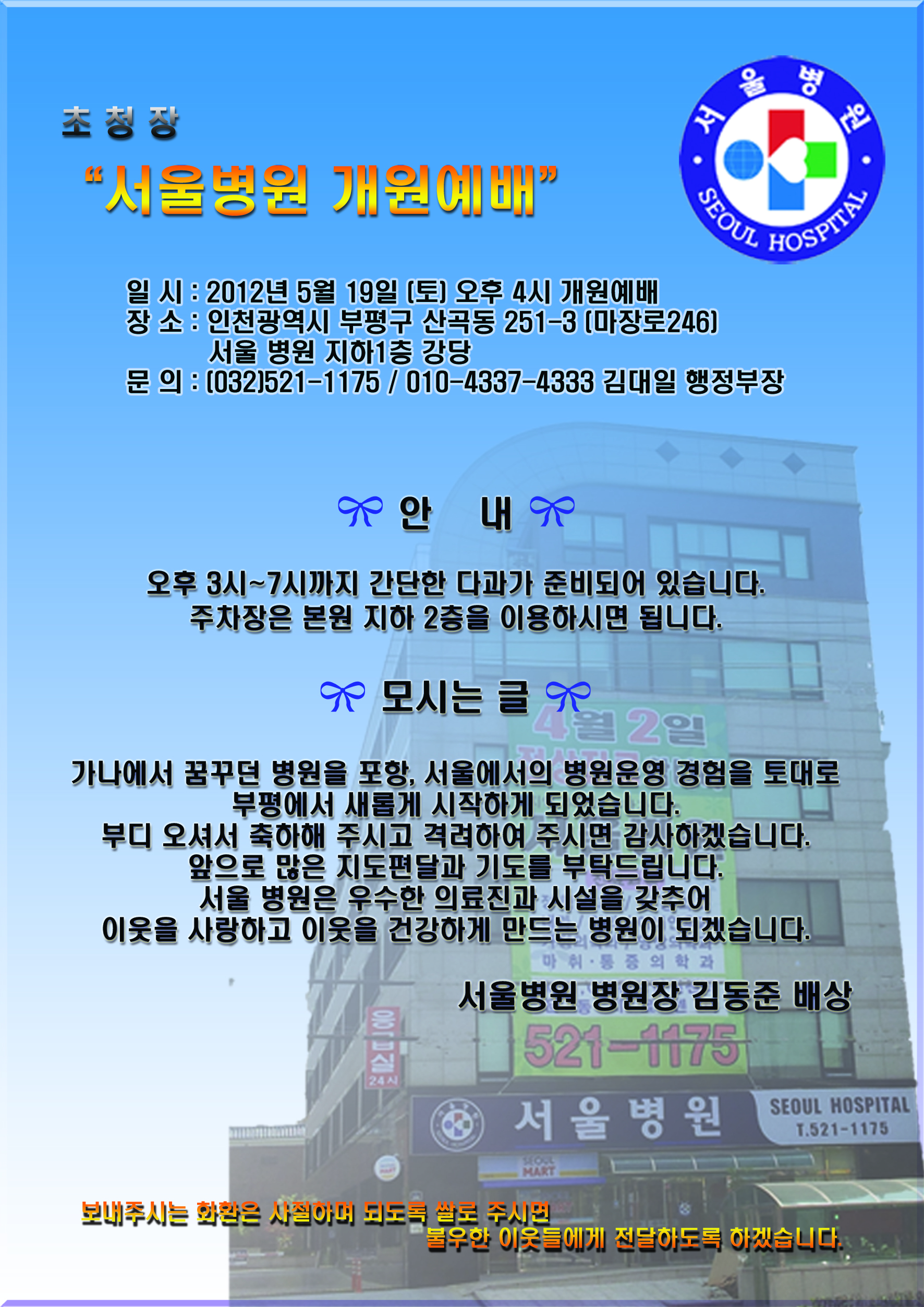 김동준 다운 선생님, 부평 서울 병원 개원예배 안내