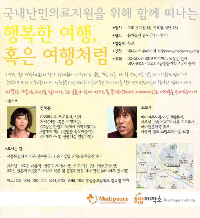 [초대]국내난민의료지원을 위한 북콘서트 - 여행 혹은 여행처럼![]() 메디피스 난민의료지원팀과 희망제작소 모금전문가학교 학생모임이 난민과 함께 들려주는 이야기, "국내난민 의료지원을 위한 북콘서트 - 여행 혹은 여행처럼"에 여러분을 초대합니다. 1. 일시 : 2011년 12월 1일 목요일 늦은 7시 2. 장소 : 문화공간 숨도 (서울시 마포구 신수동 31-1 숨도빌딩 3. 참가신청방법 : 아래 주소를 인터넷 창에 입력 -> 참가신청 페이지 정보 작성하기 http://seminar.donus.org/medi/applications.php 관심있는 분들의 많은 참여 부탁드립니다. ^^ |