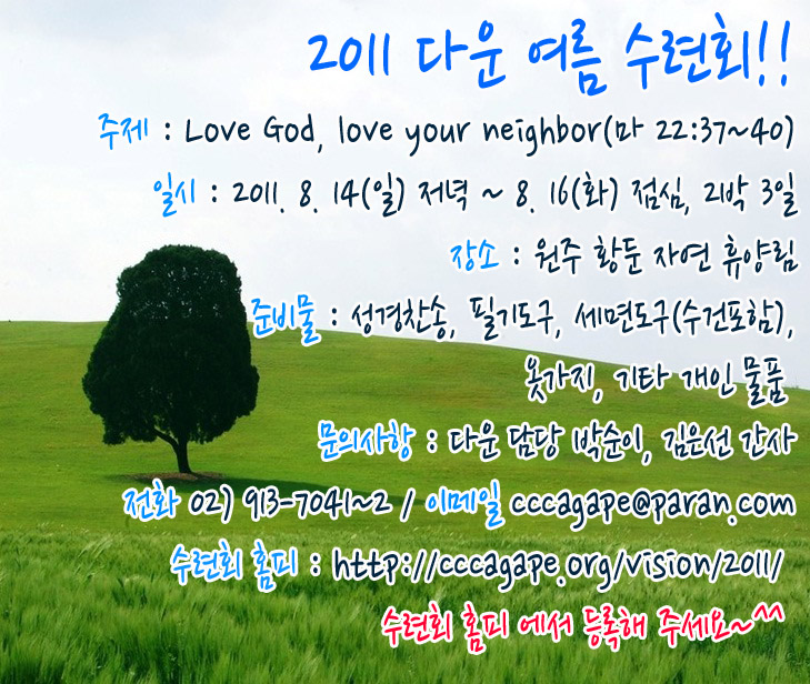 (http://cccagape.org/vision/2011/) 보시고 2차등록 8월 7일까지 해주세요~♡