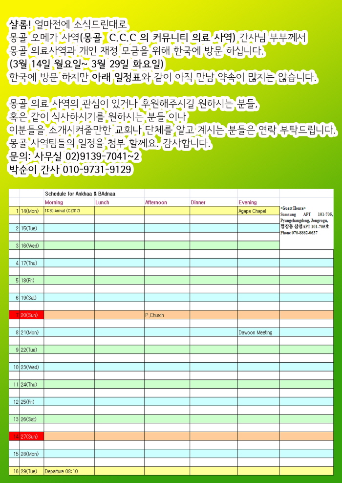 몽골의료사역팀의 한국 방문 일정과 요청