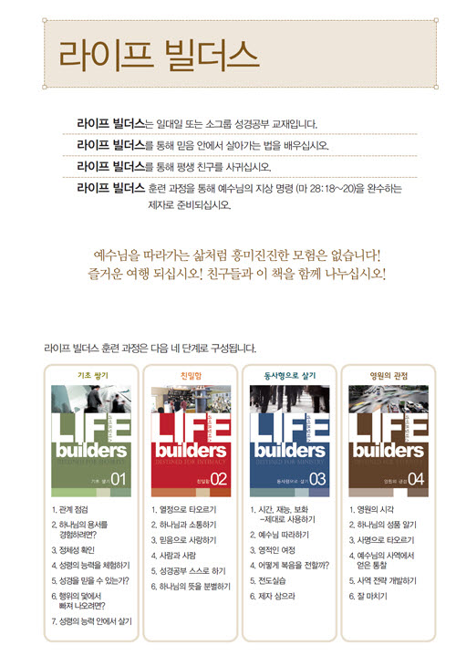기초쌓기 - 관계점검, 하나님의 용서를 경험하려면, 정체성 확인, 성령의 능력을 체험하기, 성경을 믿을 수 있는가, 행위의 덫에서 빠져 나오려면, 성령의 능력 안에서 살기