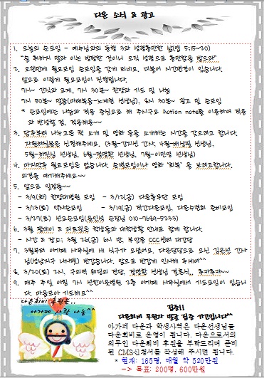 4. 마지막주 월요모임은 없습니다. 순별모임이나 영화‘회복’을 보려고합니다. 의견을 이야기해주세요~~