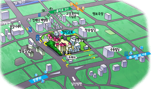 영락교회는 2,3호선 을지로 3가역 12번 출구(2호선쪽 출구입니다)로 나와서 뒤로 돌아 사거리에서 우회전해서 쭉 올라오시면 됩니다. 신호등을 건너 가시면 정문이고 건너편에 우리은행이 있답니다. (인제대 서울백병원쪽 출입구는 정문은 아닙니다.)