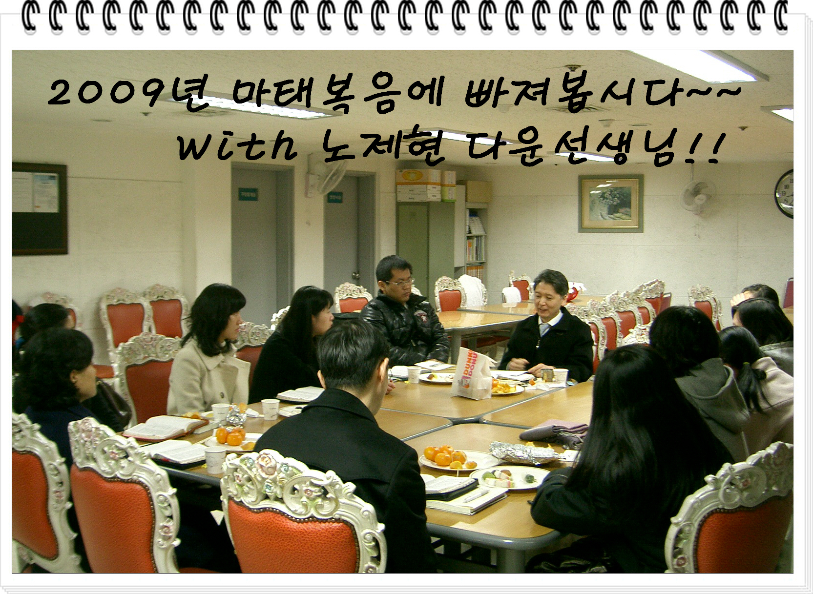 2009년도를 시작하며 고대 다운이신 노제현 선생님께서 마태복음을 전해주고 계십니다. 5일 모임에서는 전제적인 성경개관을 얘기해 주셨는데요 매주매주 마태복음을 통해 주님의 말씀을 더욱 사모하는 아가페인들이 되기를 소원합니다.