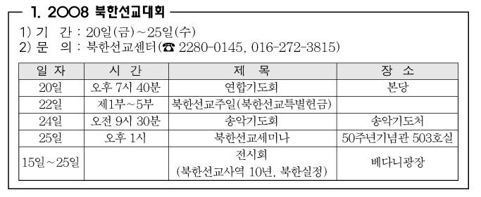 이번주 금요일에 서울 영락교회에서 있을 2008 북한선교대회의 연합기도회로 아가페 리트릿을 드리려고 합니다. 20일 7시 30분에 2,3호선 을지로 3가역 근처에 있는 영락교회 정문에서 만나 본당에서 있을 연합기도회에 참석할 예정입니다.