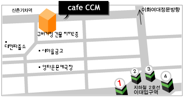 위치는 2호선 이대역에서(1~4번출구) 내려서 신촌 기차역쪽으로 가셔서 건너편에 구버거킹 건물 지하 2층에 cafeccm이라는 곳이 있습니다. 시간은 7시 30분부터 10시까지 할 예정이니 오셔서 귀한 시간 갖아요~~
