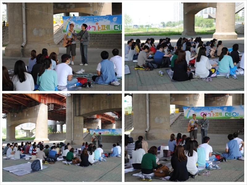 다 같이 모여서 한강대교 밑에서 예배드리고 있는 모습이네요~