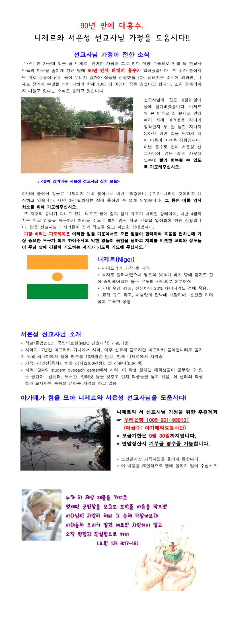서은성 선교사님 니제르 홍수피해 후원모금안내 > 아가페 뉴스