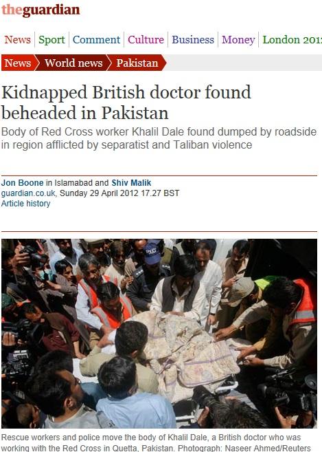 피랍 영국인 참수, 英적십자소속 의사 파키스탄에서 시신으로 발견![]() 피랍 영국인 참수, 英적십자소속 의사 파키스탄에서 시신으로 발견 파키스탄에서 피랍됐던 영국인이 참수당한 채 발견됐다. 영국 언론 가디언지는 현지시간 29일 “피랍됐던 영국인 의사가 참수된 채 발견됐다”고 보도했다. 보도에 따르면 이날 파키스탄의 발루치스탄주 쿠에타에서 발견된 시신은 약 4개월 전 피랍당한 영국적십자사 직원 칼릴 라스제드 데일(60)인 것으로 밝혀졌다. 참수된 시신은 무장반군 ‘테흐릭 이 탈레반 파키스탄’ 활동지역인 발루치스탄주의 외곽 도로에서 발견됐으며 납치범의 요구가 받아들여지지 않았으므로 데일을 살해했다는 내용의 메모가 함께 있었던 것으로 전해졌다. 이와 함께 “참수 장면을 찍은 비디오 동영상을 곧 공개하겠다”는 내용 역시 메모에 덧붙여져 있는 것으로 알려졌다. 한편 데일은 쿠에타 지역에서 1년 가까이 적십자사의 건강프로그램을 담당해왔으며 1월5일 적십자 쿠에타 사무국근처에서 운전 중 8명의 무장괴한에 의해 피랍됐다. 사진 = 영국 가디언지 홈페이지 캡처(피랍 영국인 참수) 서울신문 Boom 뉴스팀 " rel="nofollow"> 파키스탄 병원 간사님들의 안전을 위해서도 기도를 해야겠고, 아직 피랍 중인 현지인 직원을 위해서도 기도를 계속 부탁드립니다. |