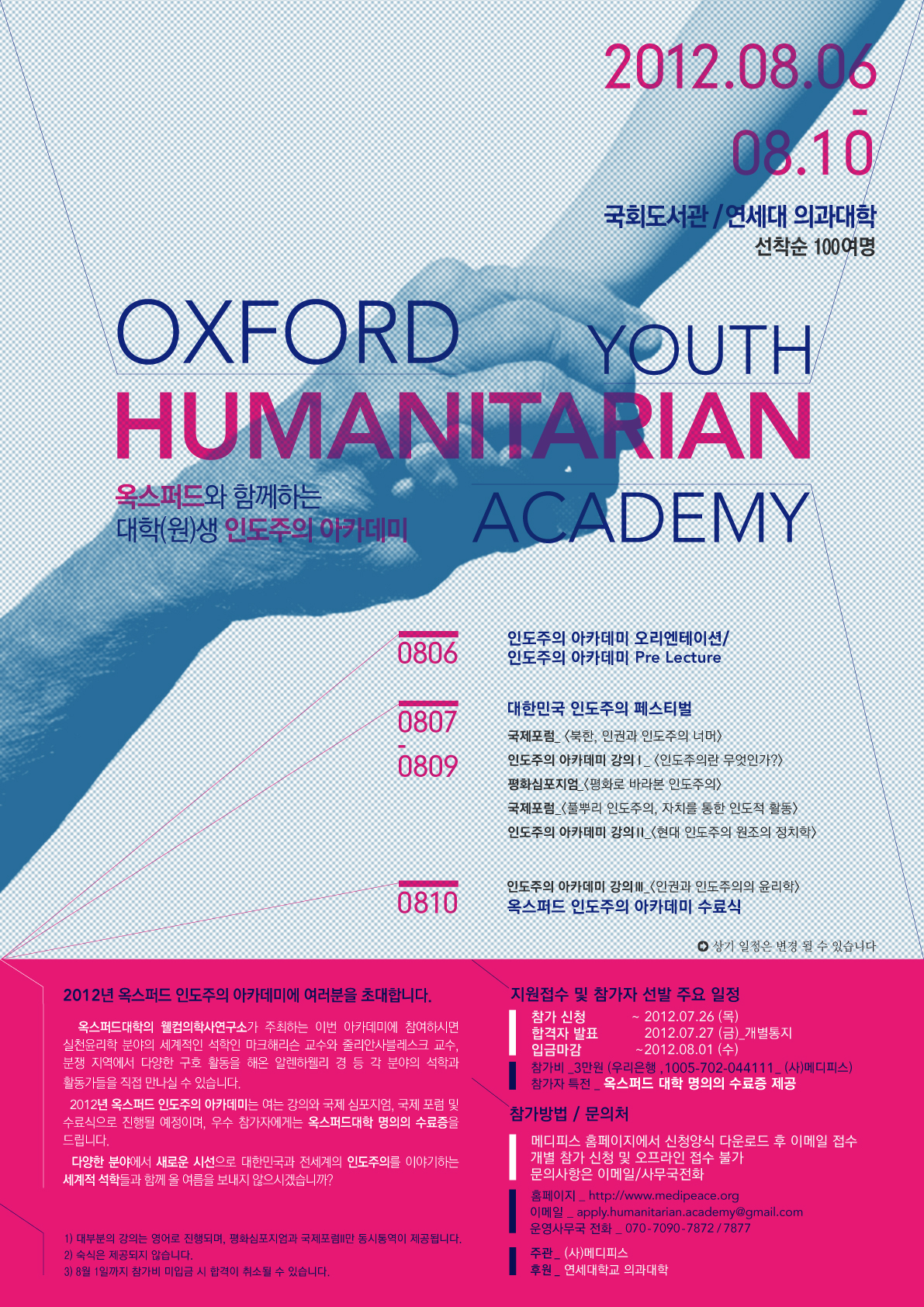 ![]() OXFORD YOUTH HUMANITARIAN ACADEMY -옥스퍼드 대학과 함께하는 청년 인도주의 아카데미- 1. 모시는 글 옥스퍼드대학의 웰컴의학사연구소가 주최하는 이번 아카데미에 참여하시면 실천윤리학 분야의 세계적은 석학인 마크 해리슨 교수와 줄리안사블레스크 교수, 분쟁 지역에서 다양한 구호 활동을 해온 알레하웰리 경 등 각 분야의 석학과 활동가들을 직접 만나실 수 있습니다. 2012년 옥스퍼드 인도주의 아카데미는 여는 강의와 국제 심포지엄, 국제포럼 및 수료식으로 진행될 예정이며, 참가자에게는 옥스퍼드대학 명의의 수료증을 드립니다. 다양한 분야에서 새로운 시선으로 대한민국과 전세계의 인도주의를 이야기하는 세계적 석학들과 함께 올 여름을 보내시지 않으시겠습니까? 2. 개요 (1) 대 상: 대한민국 청년 100여명 (2) 주 최: 옥스퍼드 웰컴의학사연구소 (3) 주 관: (사)메디피스, 유엔과 국제활동 정보센터(ICUNIA) (4) 후 원: 연세대학교 의과대학 (5) 장 소: 국회의사당, 연세대학교 의과대학 (6) 기 간: 2012년 8월 6일 ~ 8월 10일 시간 프로그램 장소 8/6 월 10:00-17:00 인도주의 아카데미 오리엔테이션 인도주의 아카데미 Pre-Lecture 연세대학교 의과대학 8/7 화 13:00-17:00 - 국제포럼 I: 북한, 인권과 인도주의 넘어 연세대학교 의과대학 18:30-21:30 -인도주의 아카데미 강의 I: 인도주의란 무엇인가? 8/8 수 10:30-17:00 -평화심포지엄: 평화로 바라본 인도주의 국회도서관 8/9 목 13:00-17:00 -국제포럼 II:풀뿌리 인도주의, 자치를 통한 인도적 활동 연세대학교 의과대학 18:30-21:30 -인도주의 아카데미 강의 II: 인권과 인도주의 원조의 정치학 8/10금 18:30-21:30 - 인도주의 아카데미 강의 III: 인권과 인도주의의 윤리학 - 옥스퍼드 인도주의 아카데미 수료식 연세대학교 의과대학 (7) 참가자 특전: 옥스퍼드 대학(옥스퍼드 웰컴의학사연구소) 명의의 수료증 제공 (8) 참가비: 3만원 - 입금계좌: 우리은행 1005-702-044111, (사)메디피스 (9) 지원접수 및 참가자 선발 주요 일정 참가 신청 마감: 2012년 7월 26일 합격자 발표: 2012년 7월 27일 (개별통지) 참가비 입금일: 2012년 8월 1일까지 (10) 참가방법 및 문의처 메디피스 홈페이지(http://www.medipeace.org)에서 신청양식 다운로드 후 이메일(apply.humanitarian." rel="nofollow">) 접수 개별 참가 신청. 오프라인 접수 불가 문의처 : 이메일(apply.humanitarian." rel="nofollow">) 또는 운영사무국 전화 (070-7090-7872/7877) 3. 유의사항 (1) 대부분의 강의는 영어로 진행되며, 평화심포지엄과 국제포럼II에만 동시통역이 제공됩니다. (2) 숙식은 제공되지 않습니다. (3) 8월 1일까지 참가비 미입금 시 합격이 취소 될 수 있습니다. |