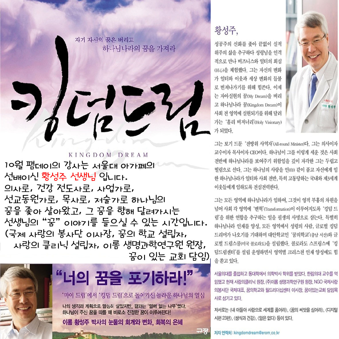 2011년 10월 31일 주제가 있는 팸데이 광고&소식^^![]() 1) 10월 주제가 있는 팸데이에 오신 순장님들을 환영하고 축복합니다. 2) 토요일 노숙인 무료 주말 진료소 진료가 매주 토요일마다 있습니다. 주말진료 자원봉사 신청을 해주세요~(아가페 홈페이지 소식과 나눔 뉴스 참조) < 의료진 섬김현황 > 10월 22일:(의)김일수, 구자중 (약) 김지호, 염혜원 (간)조영민 * 함께 섬길 의료진을 계속 모집합니다. 매월 의사 10명, 간호사 5명, 약사 5명 필요. 3) 11월 찾아가는 다운 리트릿 일시 : 11월 11일(금) 6시 30분 장소 : 삼성 서울 병원 암센터 기독교실 4) 11월 주제가 있는 팸데이^^ 일시& 장소 : 11월 21일(월) 7시 / 동숭교회 11월 주제가 있는 팸데이는 학생들과 함께하는 추수감사 채플로 학생들과 함께 하는 시간을 가지려고 합니다. 5) 태국 WAIT 의료봉사 의료진 모집 일정: 2012년 2월 1일(수)~ 2월 5일(일) : 진료 일정 (2/1~3) * 학생일정 1/26~2/10 장소: 태국 치앙마이 근처, 봉사내용: 각종 무료진료활동 참가비: 약 100만원 내외 모집인원: 의사, 약사, 간호사 각 3명 모집기간: 11월 30일까지 6) 아가페하우스(충남 당진 펜션)를 오픈했습니다. (http://cccagape.org/agapehouse/pension.php) 아가페 다운들이 저렴하게 편안히 쉬어갈수 있는 곳! 신청은 사무실로 해주세요~!! < 다운회비 후원안내^^ > 아가페 다운과 학생사역은 다운선생님들 다운회비로 운영이 됩니다. 다운으로서의 의무인 다운회비 후원을 부탁드리며 준비된 CMS신청서를 작성해 주시면 됩니다. - 10월 신규후원자: 이종숙 * 현재(9월): 220명, 약 690만원 -> 목표: 300명, 800만원 |