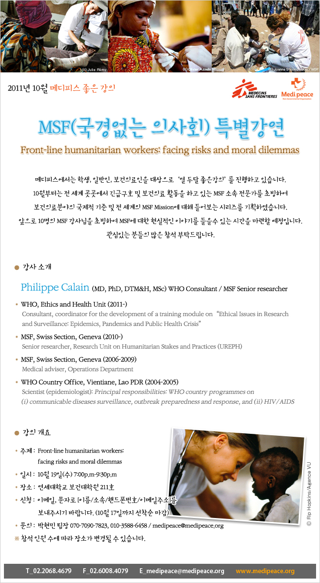 앞서 광고 드린 바대로, MSF 또는 WHO에 대한 실질적인 활동정보에 목말라하는 여러분들을 위해 메디피스에서 기획한 무료 강연시리즈입니다.