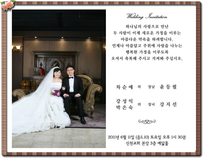 적간 00 다운 강지선 결혼소식 전합니다!!![]() ![]() 샬롬~~ 적간 00다운 강지선입니다.. 작년 8월까지 3년간 아가페 다운간사로 지내다 현재는 고대 안암병원에서 순환기 내과 연구간호사로 있습니다. 사역을 마치고 하나님께서 귀한 평생의 동역자를 주셔서 결혼을 하게 되었습니다. 뉴욕 자비량을 같이 갔던 형제가 교회 형을 소개시켜 주어 만나게 되었구요 만나면서 하나님께서 예비하신 평생돕는 배필임을 확신하게 되었습니다. 결혼은 신림역 근처에 있는 형제네 교회(신천교회)에서 하게 되었구요 6월 11일 토요일 1시 반입니다. 하나님께서 기뻐하시는 귀한 예배로 드리고 싶구요 시간되시면 오셔서 많이 많이 축하해 주세요!! 집은 신랑 직장 근처인 충남 아산에 구했습니다. 온양온천역이구요 다음에 연락주시고 언제든지 놀러오시구요 거기서도 충남 아가페 모임을 갖을 예정입니다.. 함께 하고싶은분들 연락주시고 각종 모임 환영입니다!! 샬롬!! E-청첩장 사진 구경하기!! http://www.yourcard.co.kr/new_page/new_blog_main.php?b_id=kjs2125 오셔서 축하해주세요~~