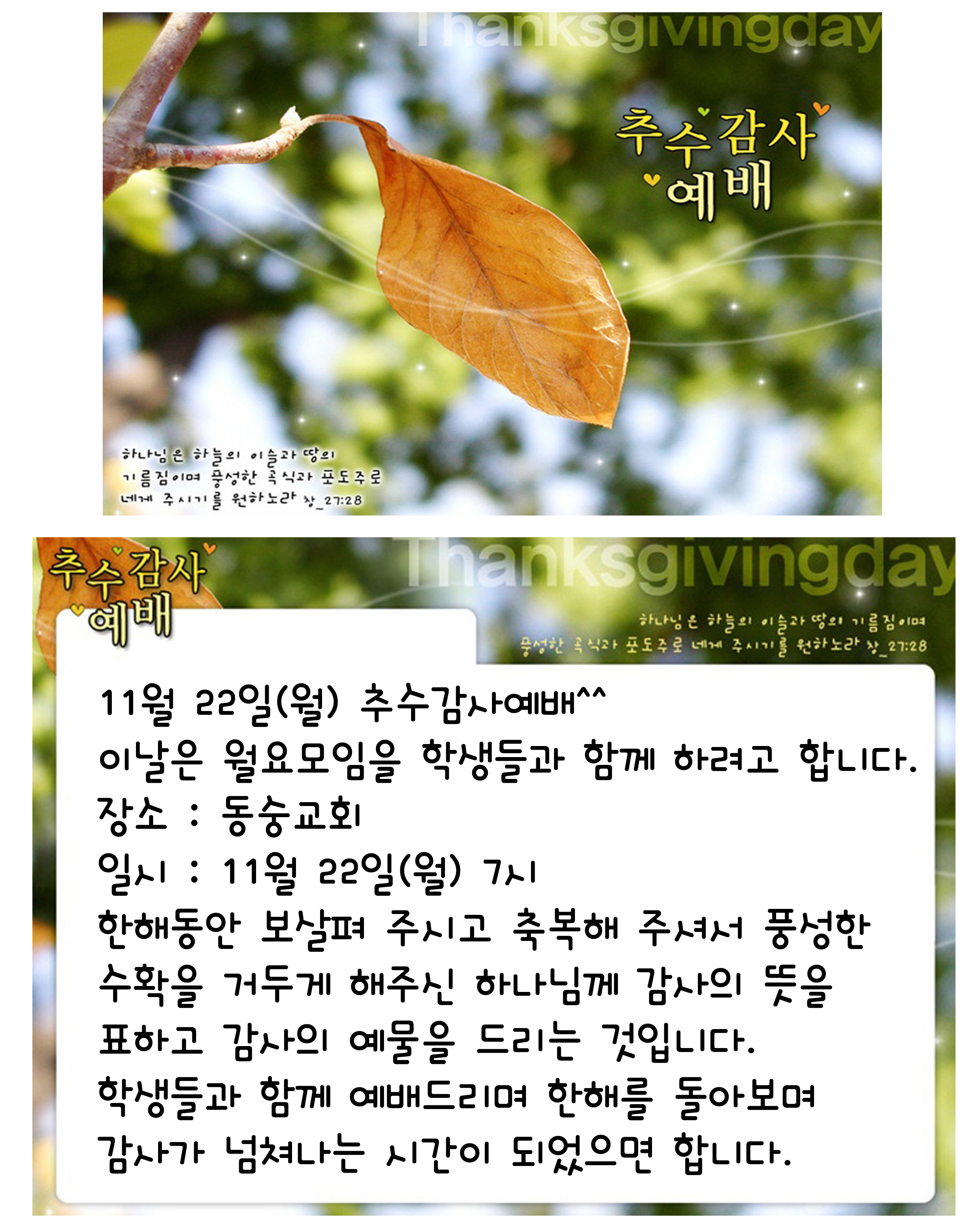 3. <추수감사예배> 11월 22일 월요모임은 추수감사예배로 학생들과 함께 하려고 합니다.