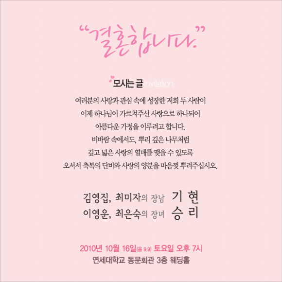 10월 16일 토요일 저녁 7시, 신촌 연세대학교 동문회관 3층 웨딩홀에서 결혼합니다.