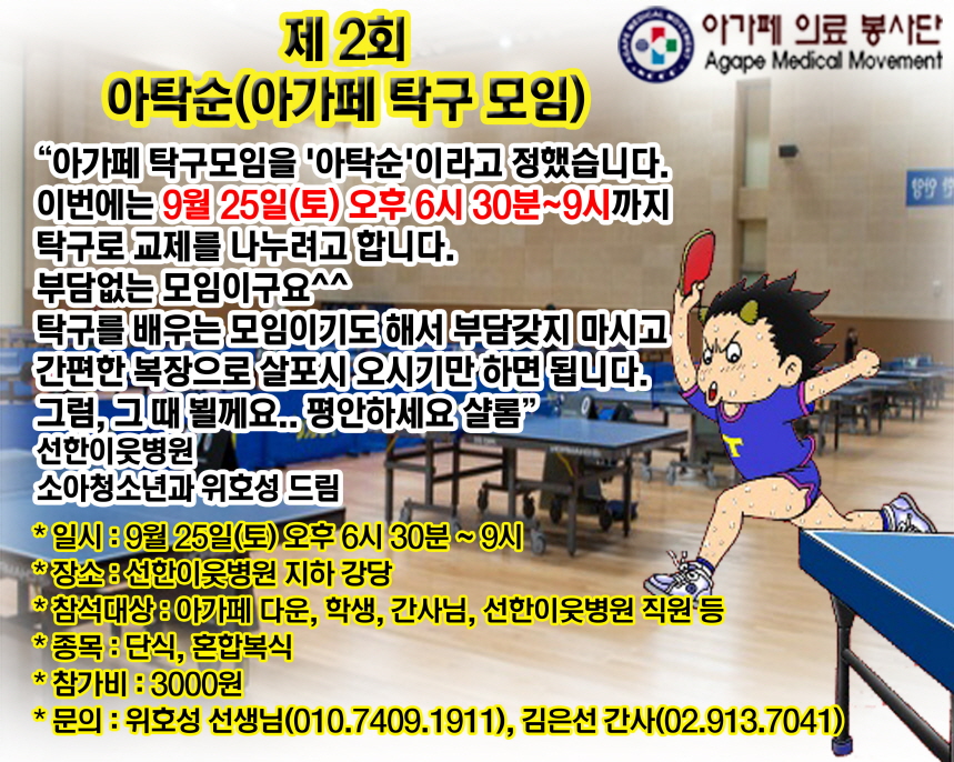 제 2회 아가페 탁구 순모임을 가지려고 합니다.