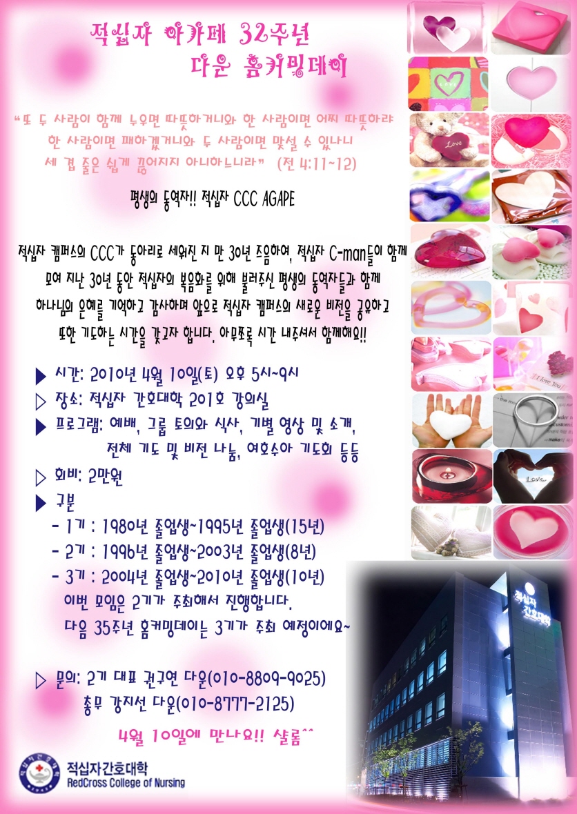 다들 보고파서 이렇게 모임을 갖게 되었습니다. 학생들과는 2학기에 전체 홈커밍데이를 갖을 예정이랍니다. 78년부터 시작된 적십자 아가페.. 세계 복음화의 반석으로 앞으로도 쭈욱 나갈껍니다!! 샬롬^^
