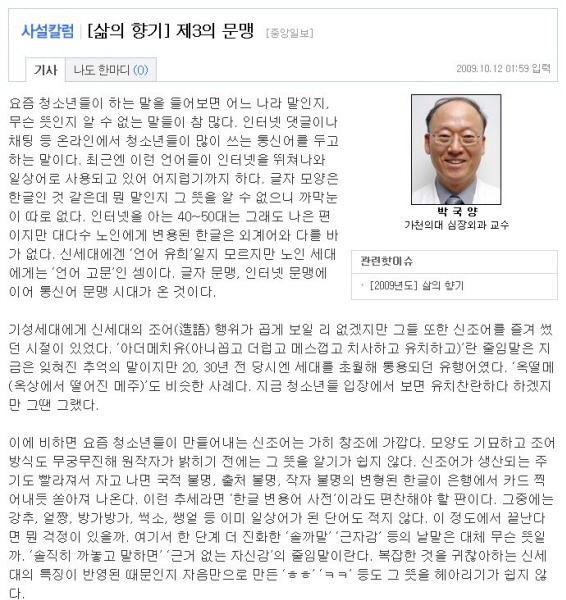 중앙일보에 실린 박국양 선생님의 사설 칼럼입니다~~