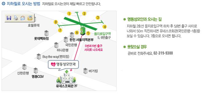 2호선 을지로입구역 5~6번 출구 사이로 나오셔서 명동쪽 유네스코 회관 7층 명동성모안과(김동해 가대 다운선생님 병원)입니다.