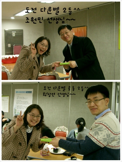 비록 마지막 문제를 마치지 못해 다운벨을 울리진 못했지만 패자부활전을 통해 다운벨 문제까지 가신 노제현 선생님 정말 존경스럽구요 더불어 공동 2위를 하신 조원민, 황창연 선생님 축하드립니다. 그리고 금년 가장 추운 날씨에도 불구하고 월요모임과 함께 해 주신 다운샘들께 감사를 드리며 푸짐한 선물의 나눔과 웃음의 시간이었습니다.