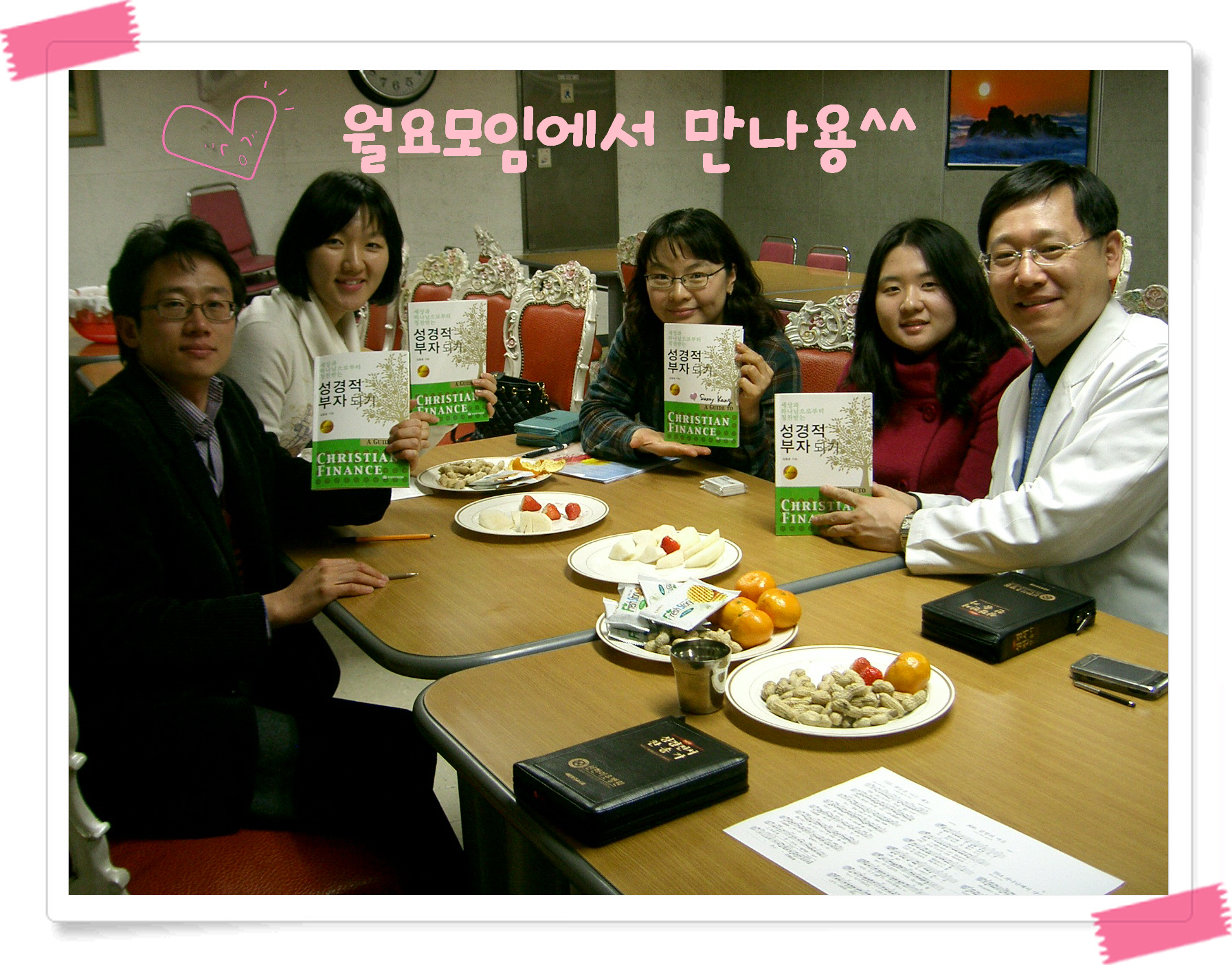 오늘은 정명환 선생님(중앙대 약대 98학번-사진의 맨 왼쪽)께서 이민영 다운의 인도로 처음 아가페 월요모임에 나오셨어요. 학생때 아가페는 아니었지만 주님의 인도하심으로 함께 하게 되어 정말 반갑고 앞으로 쭈욱 함께 하며 은혜를 누리길 기도합니다.