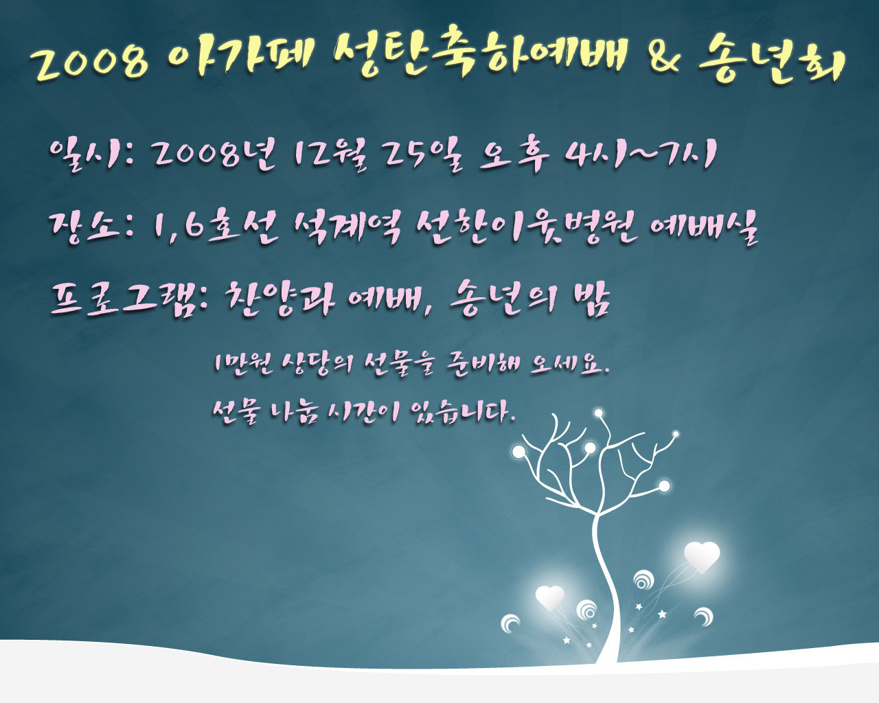 3. 12월 25일(목) 4시 성탄축하예배 겸 아가페 송년회로 선한이웃 병원에서 드려집니다. 기억하시고 2008년 마지막 아가페 모임에서 함께 하길 바래요. 선물 나눔의 시간이 있사오니 오실때 1만원 정도의 선물을 준비해 오세용!! 맛있고 푸짐한 식사 기대하시고 낼 뵈용~~