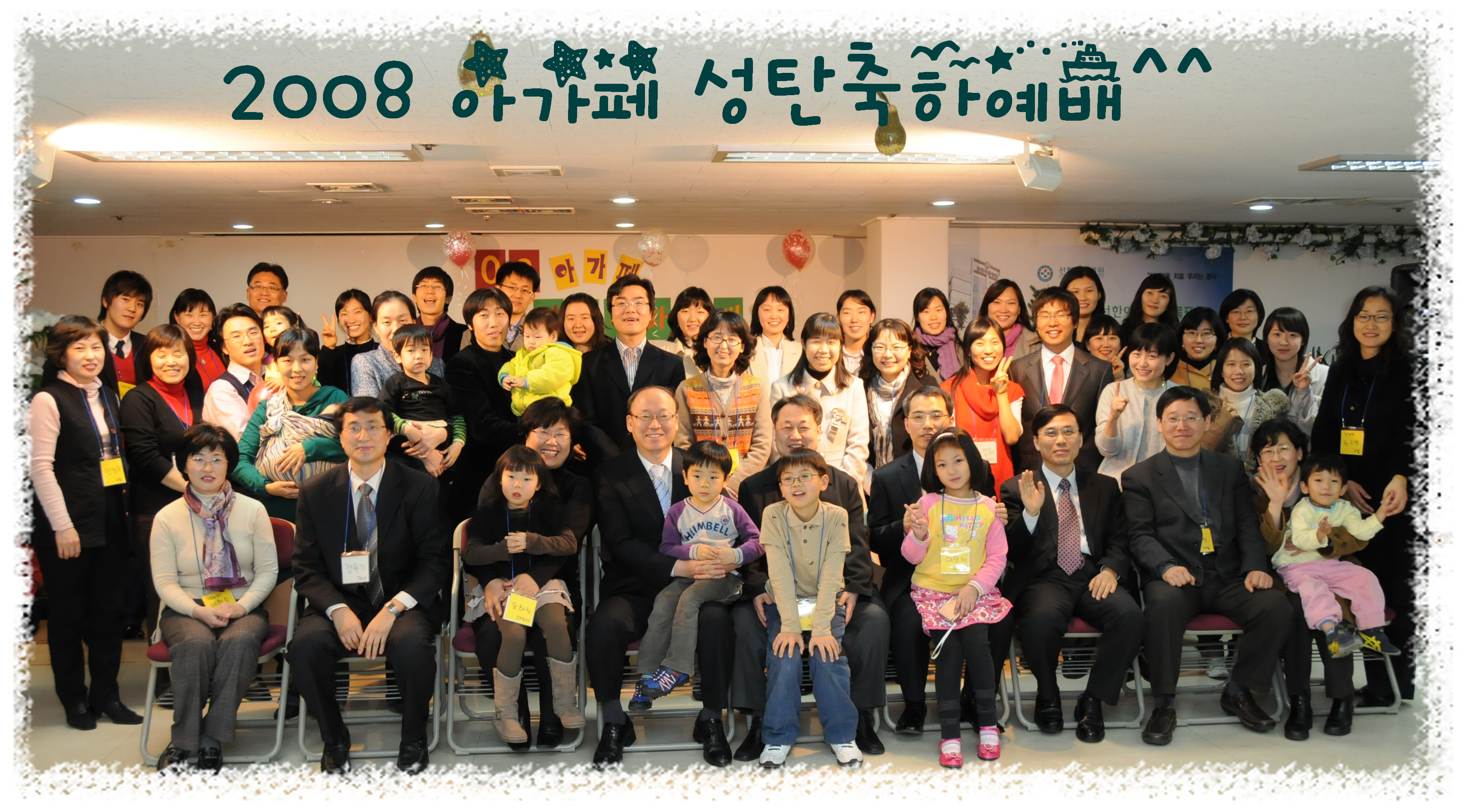 2008년 한 해도 잘 마무리하게 하신 살아계신 하나님께 감사하며 무엇보다 그 아들 예수님을 보내주신 것을 축하하며 아가페 다운들이 모였습니다. 다운선생님들과 울고 웃으며 함께 있어준 다운가족들, 캠퍼스를 든든히 지켜주는 학생들과 이 사역위에 기름부어주신 간사님들과 가족.. 참석한 모든 사람들이 성탄의 기쁨과 만남의 축복을 누리는 시간이었습니다.