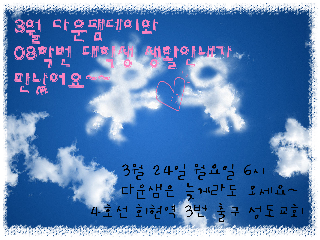 24일 월요일 오후 6시부터 식사구요 행사는 6시 30분부터 시작합니다.. 08학번 신입생들과 함께 하는 대학생 생활안내가 있는데 다운은 7시 반~8시까지 오셔서 모임 참석후 9시부터 따로 모임을 갖을 예정입니다. 일찍 오시면 함께 식사할 수 있습니당~~