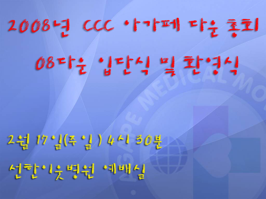 더불어 2008년을 맞아 저희 다운에 08 신입다운들이 입단을 하게 됩니다. 3년에서 길게는 6년이상 아가페안에서 훈련 받은 신입다운들을 오셔서 환영해 주시고 격려부탁드립니다.