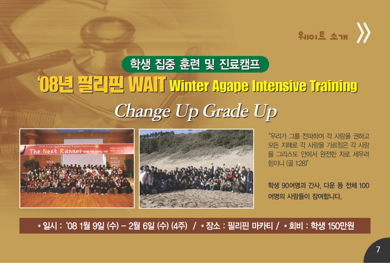지금 필리핀 마카티에서 82명의 학생과 간사님들은 웨이트 WAIT(Winter Agape Intensive Training) 훈련중입니다. 26일 아침 8시 25분 비행기로 의료진 의사 - 이정선, 간호사 - 한아영, 강지선 간사가 들어가고 먼저 가있는 약사 남궁옥 선생님과 팀을 이루어 의료사역을 감당하게 됩니다. 또한 필리핀 현지 의료진과도 만나 함께 협력 사역을 하게 될 예정입니다.