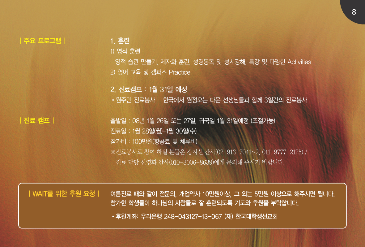 3. 해외 사역을 통하여 학생의 시각을 넓히시며 열방을 향해 열정 갖기를 원하시는 주님의 마음을 품게 하소서.