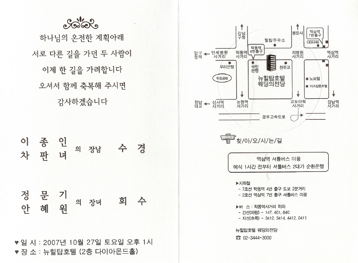 일시: 10월 27일 토요일 오후 1시 장소: 7호선 학동역 4번출구 뉴힐탑 웨딩의전당 2층 주례자: 이명춘 목사님