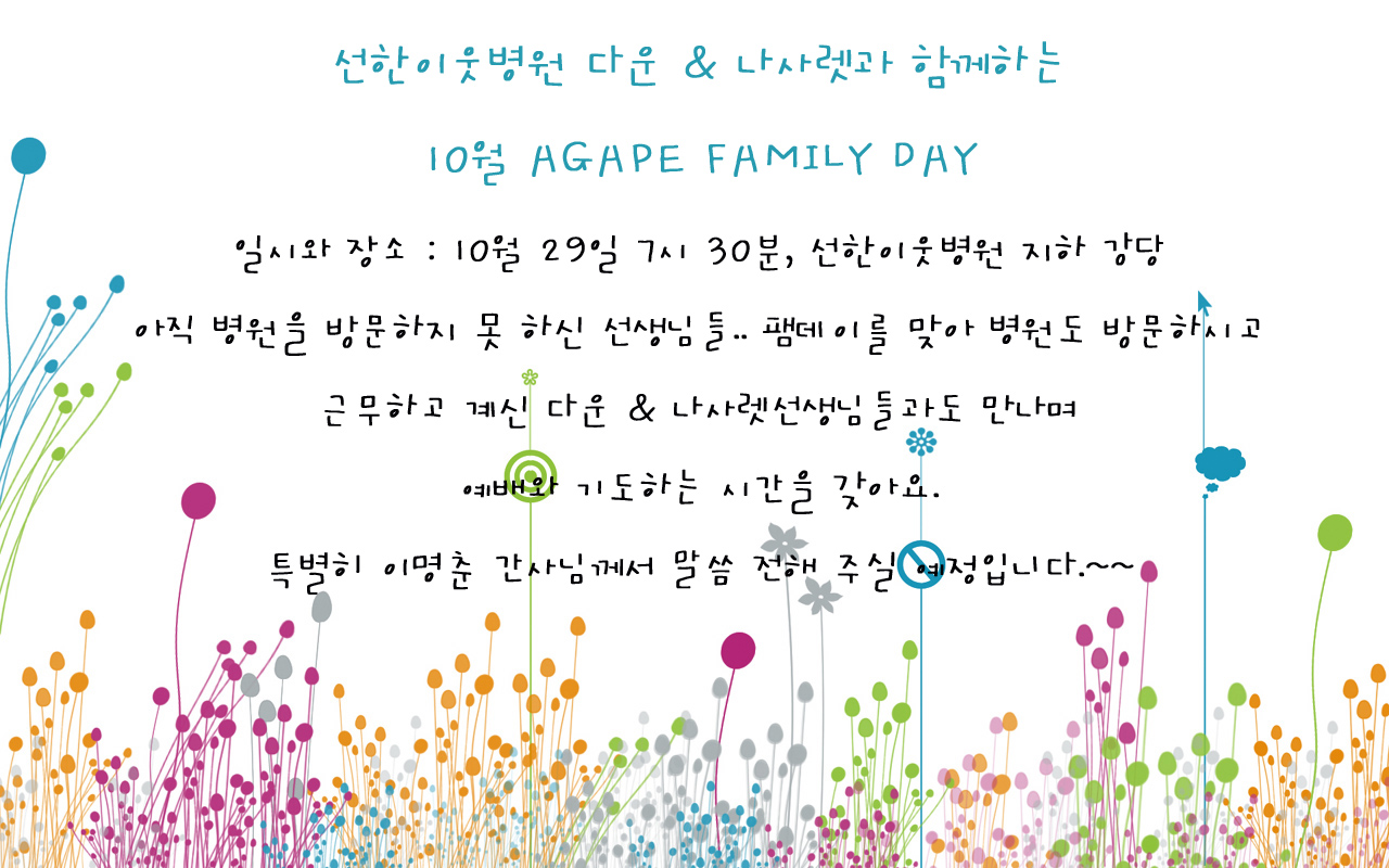 그럼 10월 아가페 패밀리데이에는 꼭 오셔서 우리 아가페의 기도제목이었던 선교병원의 응답인 선한이웃병원도 방문하시고 근무하고 계시는 다운 & 나사렛 선생님들을 위해 기도와 격려해 주세요.