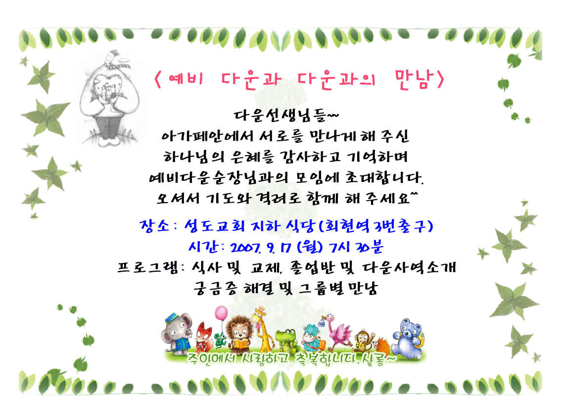 9월 17일(월) 예비다운들과의 만남이 있습니다. > 아가페 나눔터2020