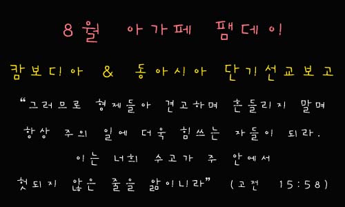 이번 팸데이에는 지난 7월말부터 8월중순까지 있었던 캄보디아와 동아시아 단기선교의 선교보고가 있습니다. 더불어 열방을 향한 하나님의 마음과 사랑을 느끼고 경험하는 시간이 되기를 소원합니다.
