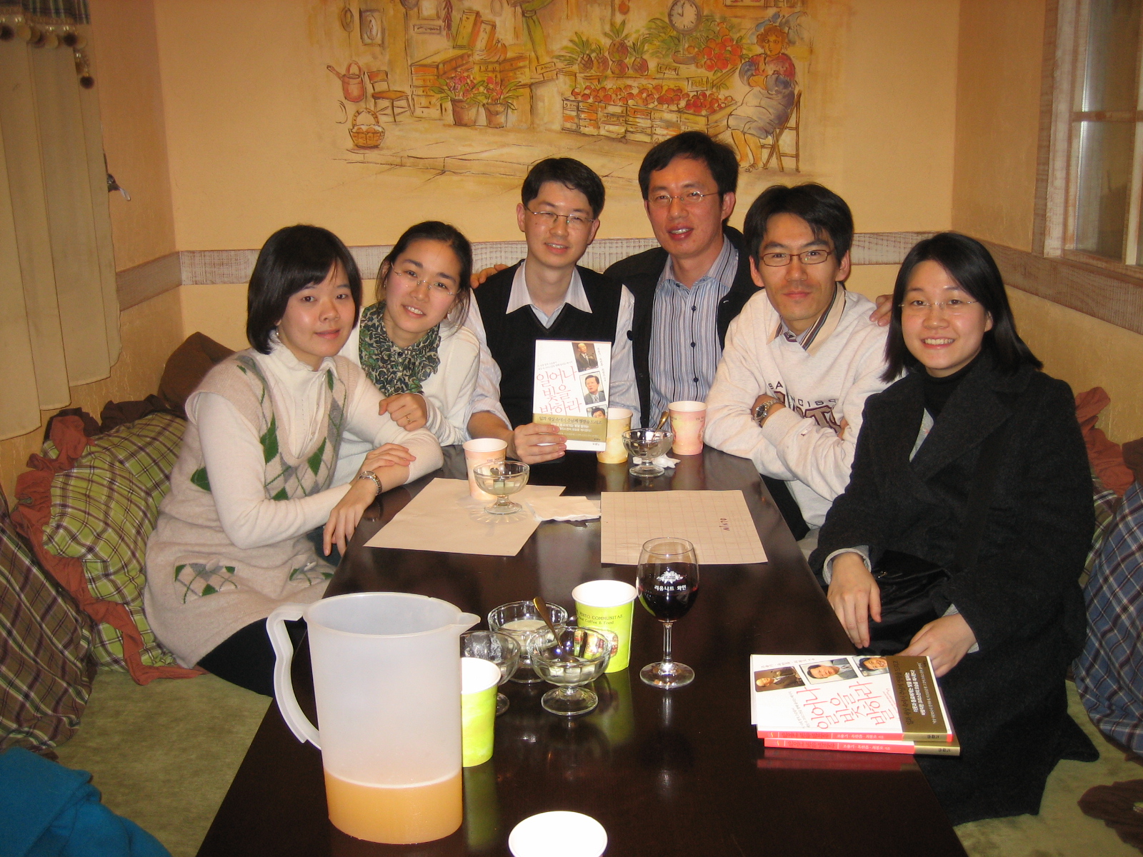 한아영, 정회수, 배상필, 문찬희, 김재현, 성유미 순장님. 와인잔에 담긴 포도쥬스가 보이고, 바로 앞에는 살구쥬스(?), 아이스크림의 잔해도 보이고, 책은 '일어나라 빛을 발하라' . . .